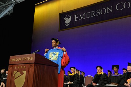 It began with the undergraduate speaker, Mutchnick, co-creator of Will & Grace and an Emerson Trustee, praising students for helping lead the Boston community through the recent marathon tragedy.