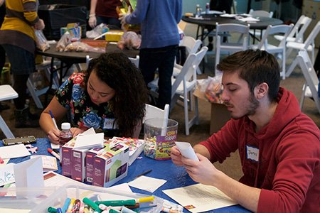 Abria Smith, a staff member of Berklee College of Music, stopped by Emerson’s Bordy Theater to craft greeting cards for the elderly as part of the MLK Day of Service. (Photo by Nick Eaton ’17)