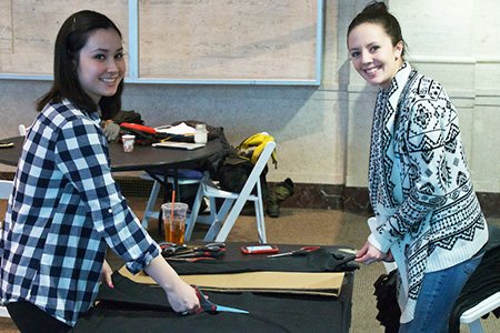 Emily Reagan ’17 and Lauren Cataldo ’18 craft scarves for homeless people recently displaced from Boston’s Long Island Shelter. (Photo by Nick Eaton ’17)