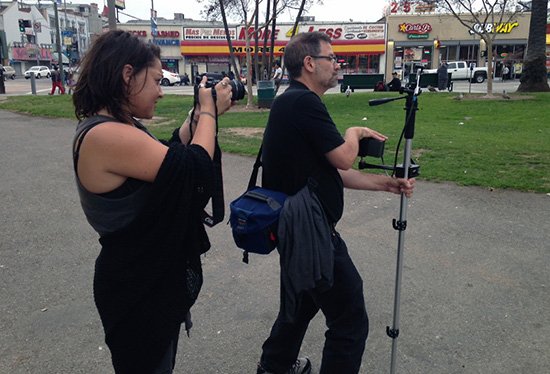Professor J. Craig Freeman and his student Lucianna Farone Coccia ’15 doing field work for the augmented reality project at MacArthur Park in Los Angeles. (Photo by Haley Lannon ’15)