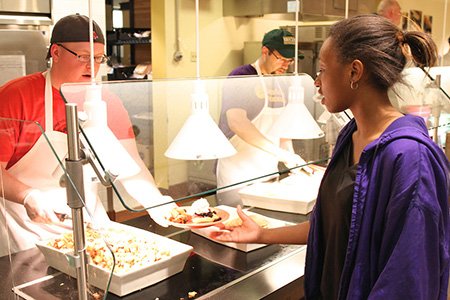 Dining staff Paula Mangiratti and Abbe Erle serve Larianny Perez ’17. (Photo by Nick Eaton ’17)