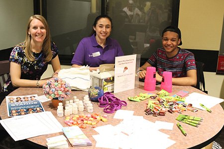 Melanie Matson of Violence Prevention and Response, Jessica Glaser of the Office of Student Success, and Malik Peacock ’18 promote the Emerson STANDS program during the Late Night Buffet on May 4. (Photo by Nick Eaton ’17)