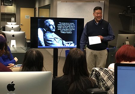 Journalism professor Paul Niwa talks to his Online Publishing class about their upcoming trip to Japan. While on the trip, the class will learn about Japanese culture and U.S.-Japan relations for their capstone project, a multimedia app on Sen. Daniel Inouye. Photo/Erin Clossey