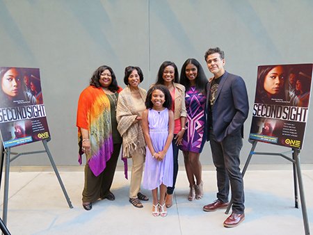 Alumna Susan Banks ’76 poses with some of the cast from Second Sight. From left: Banks, Marla Gibbs, Jessica Pressley, Tatyana Ali, Denise Boutte, and Jose Yenque. Photo/Daryl Paranada