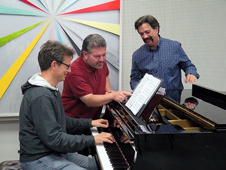 From left: Mark Hollmann, Allen Zipper P’19, and Dave Caplan rehearse in the Bill Bordy Media Conference Center at Emerson College Los Angeles. Photo/Daryl Paranada