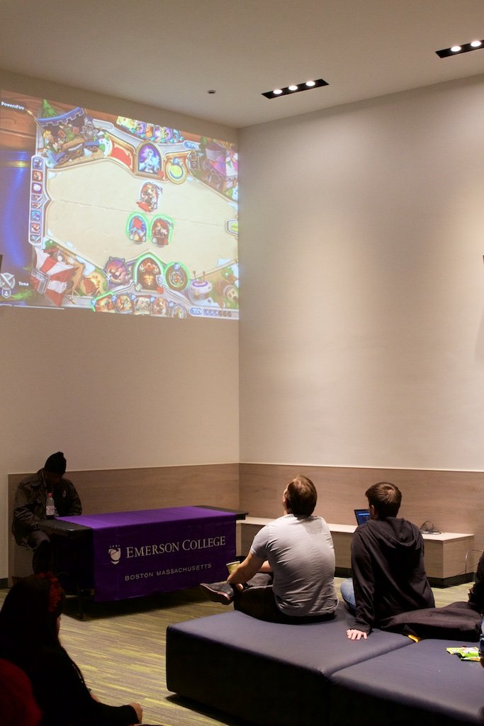 Sunday’s championship, sponsored by the Department of Communication Studies with Emerson eSports and run by Emerson students, featured 16 players who had qualified from an initial field of 64 gamers. Participants included students from schools such as Boston University, Boston College, Northeastern University, Suffolk University, and MIT, who competed at the fast-paced strategy game Hearthstone: Heroes of Warcraft.