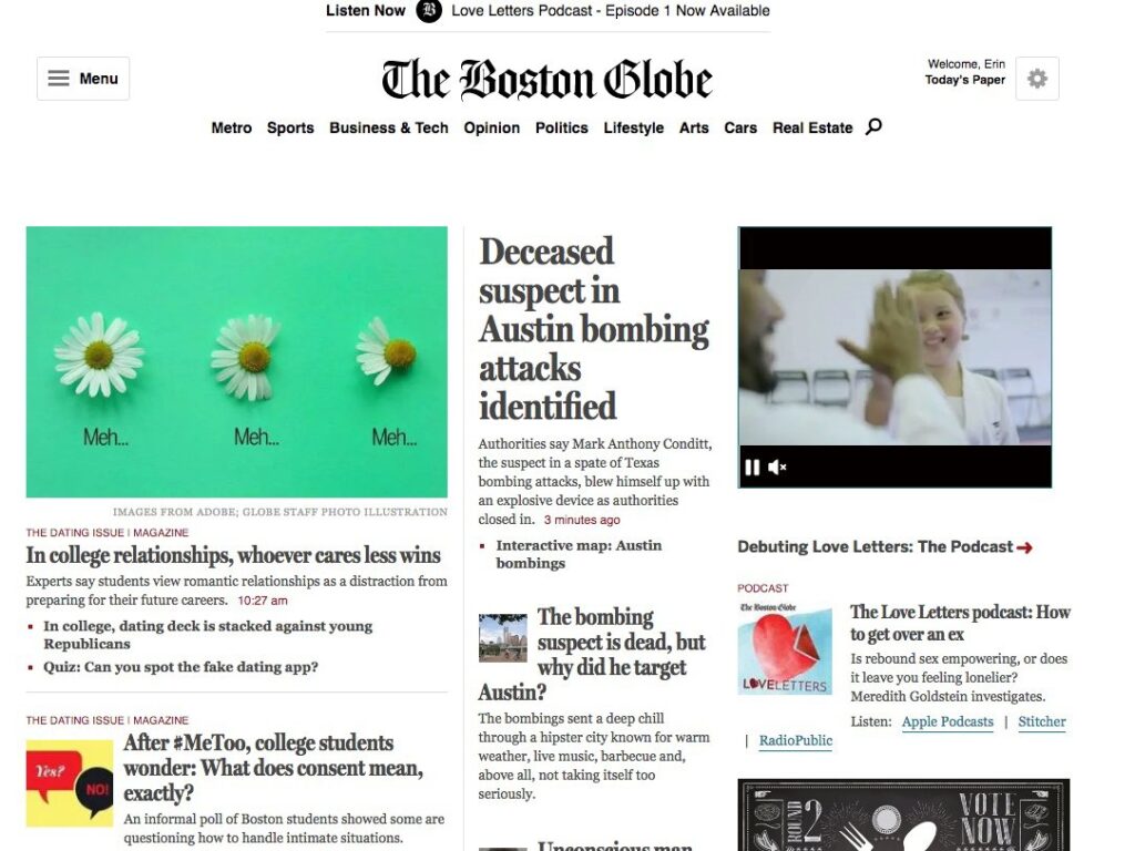 Senior Journalism major Josh Coe ’18 wrote about how hard it is for college Republicans to find love, and Brooke Knisley, an MA candidate in Publishing and Writing explored how students understand consent in the age of #MeToo. Fellow graduate student Natasha Ishak used personal experience in writing about parents who stress out about their kids using dating apps. And in case you’re over Tinder and OKCupid, grad student Melanie Thibeault has Fake Dating App quiz. Only one is fake. It better not be the one for cheese lovers.
