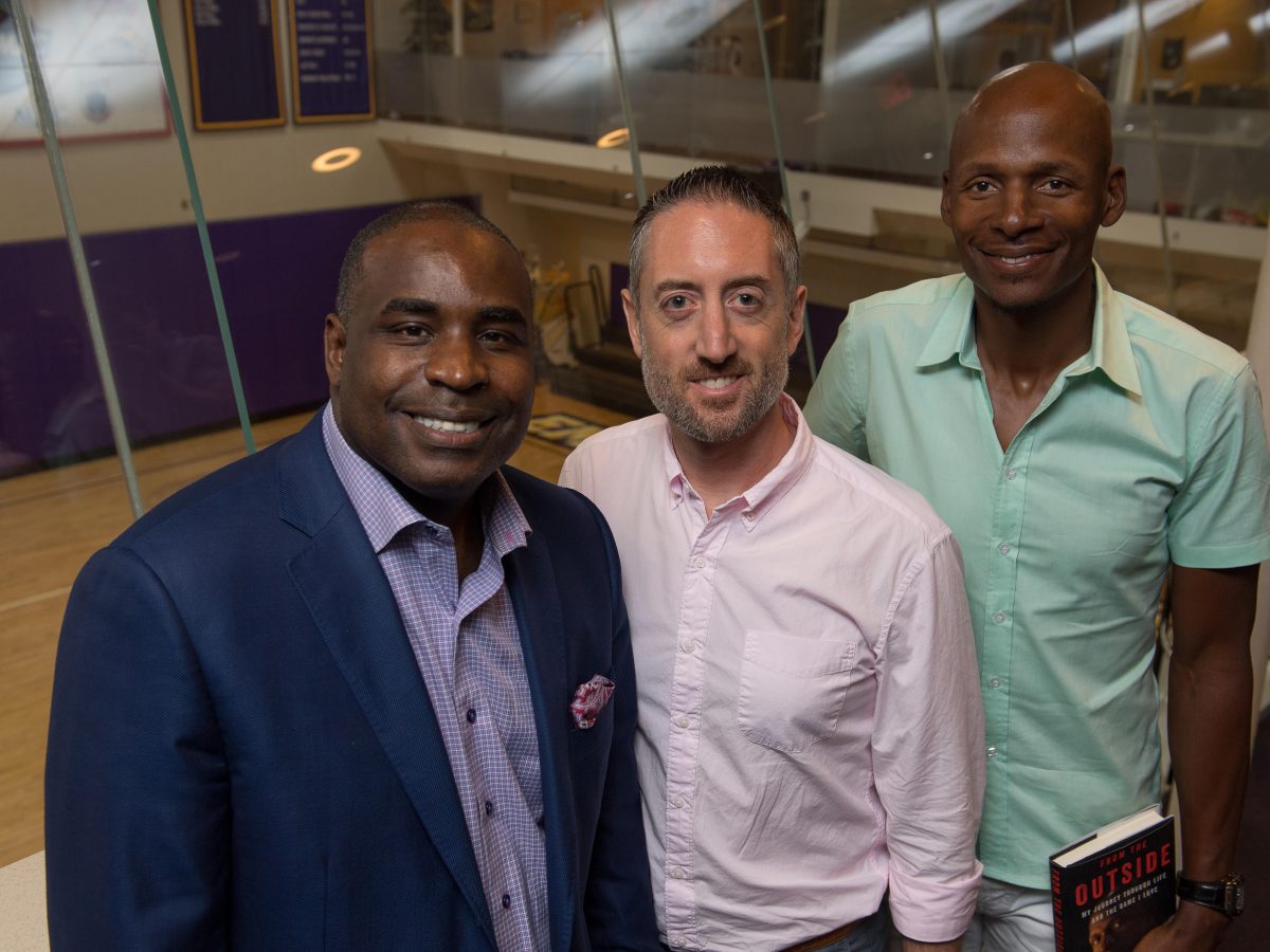 Former Boston Celtics shooter and Basketball Hall of Famer Ray Allen, right, visited the Skybox at Emerson’s Bobbi Brown and Steven Plofker Gym last week to do an interview with NBC Sports Boston anchor Kyle Draper, left, and supervising producer Jim Aberdale ’98. Photo/Derek Palmer