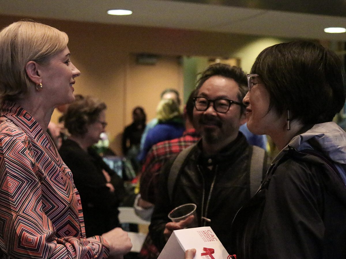 Emerson faculty Cher Knight, Yu-Jin Chang, and Shujen Wang chat during the Faculty Appreciation Reception held Tuesday, September 25, in the Bordy Theater. Photos/Claire Richards ’22
