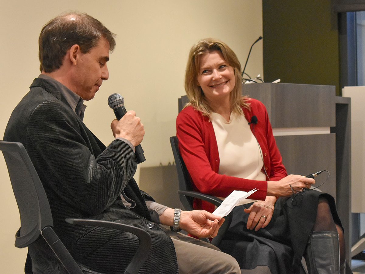 Novelist Jennifer Egan takes questions from Professor Rick Reiken at a Q&A sponsored by Writing, Literature and Publishing and held in the Beard Room on Wednesday, October 24. Egan also gave a reading from her newest novel, Manhattan Beach, later that evening in the Bright Family Screening Room. Photo/Chelsea Dickens, G’19