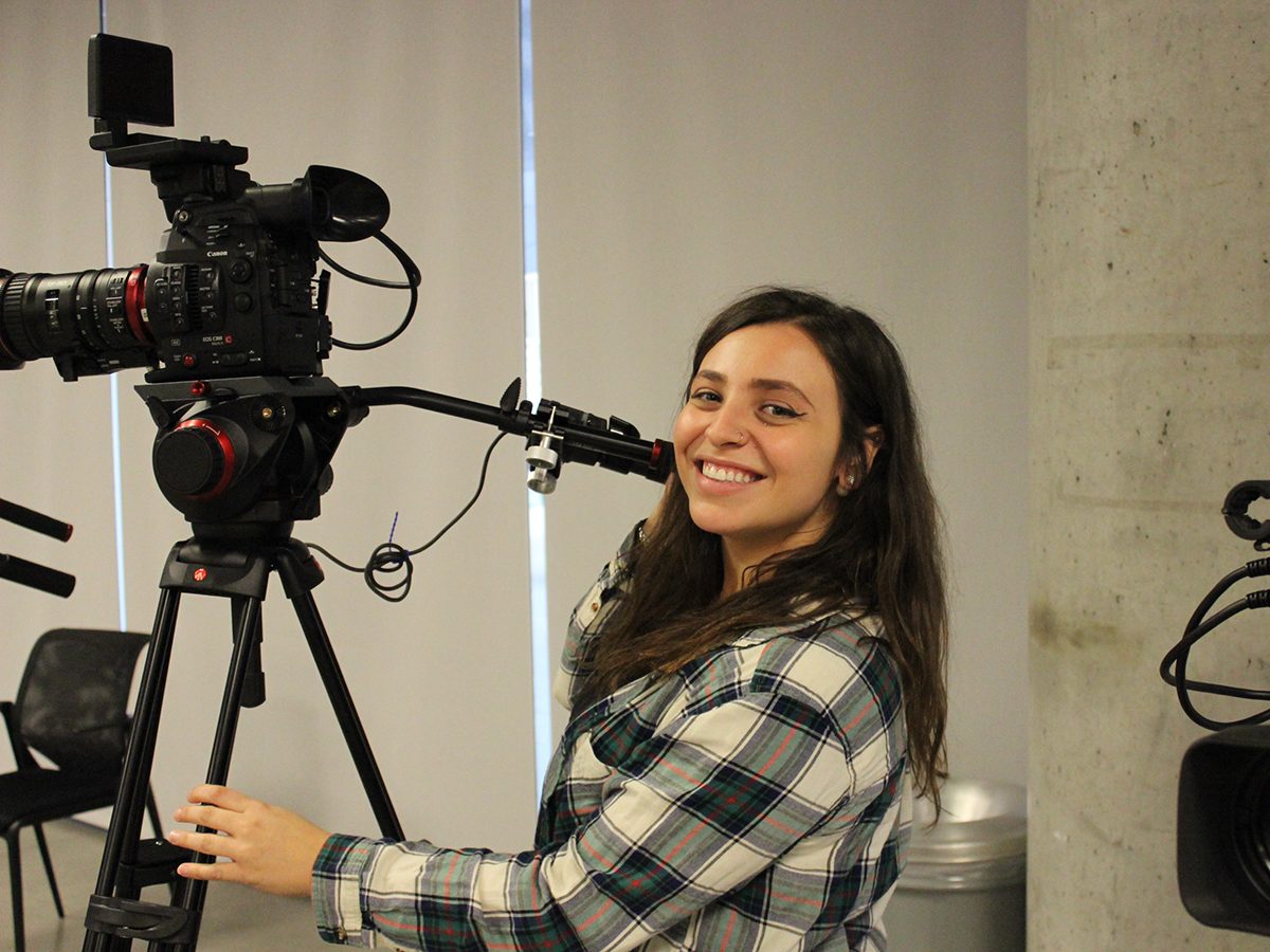 Emerson College LA student Rachael DeSantis ’19, a camera operator during the National Student Production Awards, poses with a camera. Photo/Daryl Paranada