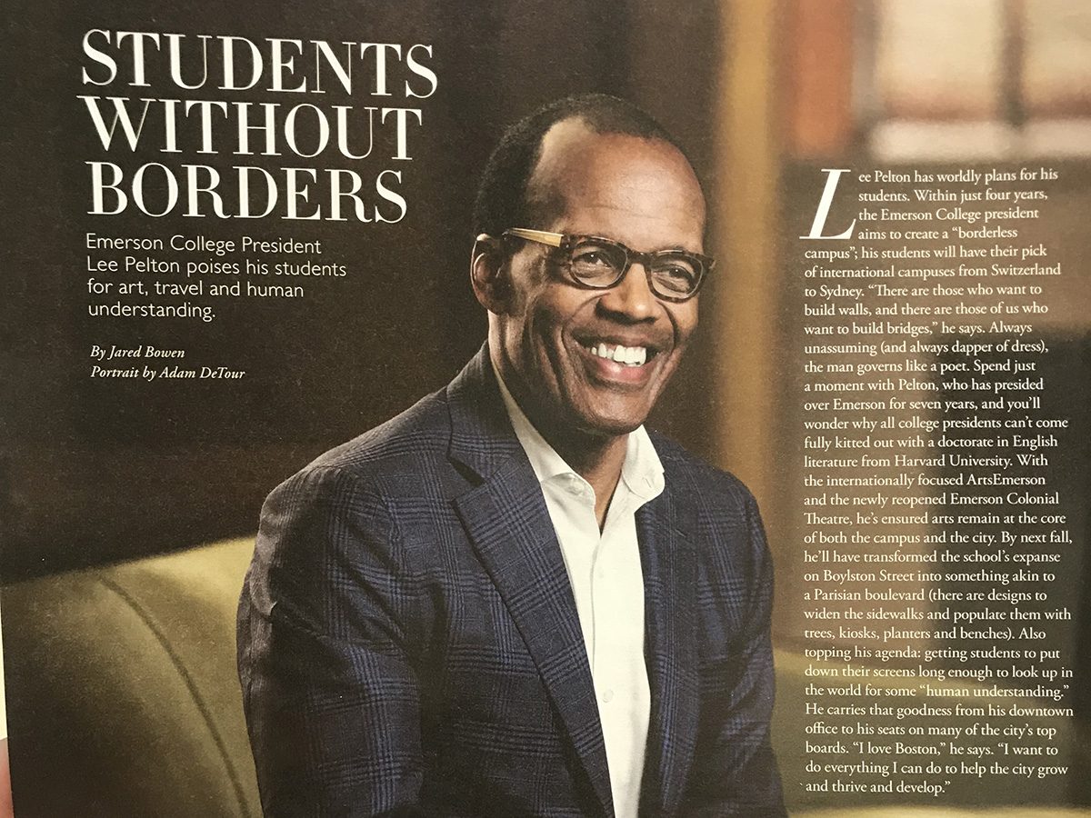 President Lee Pelton is featured in November’s Boston Common Magazine, detailing his plans for a borderless campus and upcoming transformations to Boylston Street. “There are those who want to build walls, and those of us who want to build bridges,” Pelton says.
