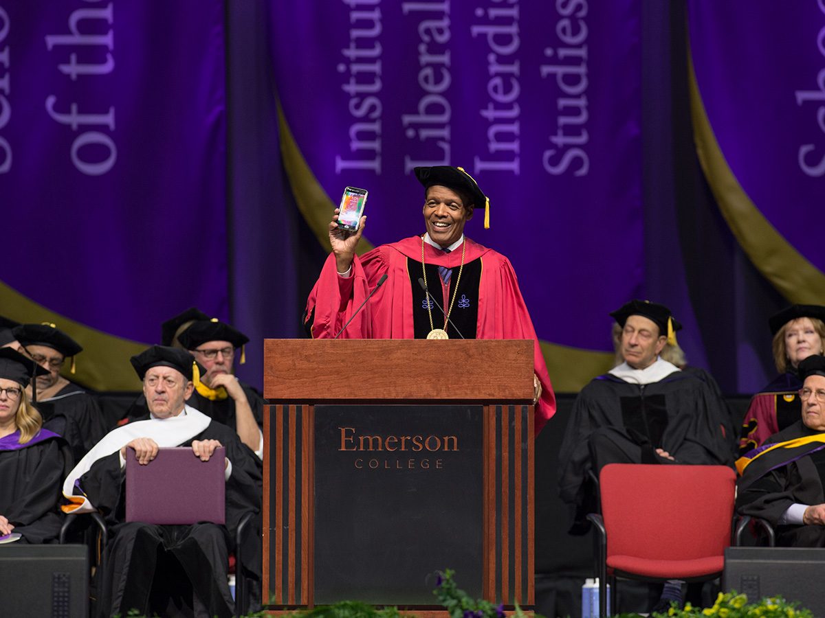 President Lee Pelton warns of the things we miss if we live too much in a “heads down” (digital) world during his 2018 Emerson Commencement Valedictory speech. That’s sage advice, but we bet he’d want you to follow these Emerson Twitter accounts. File photo/Derek Palmer