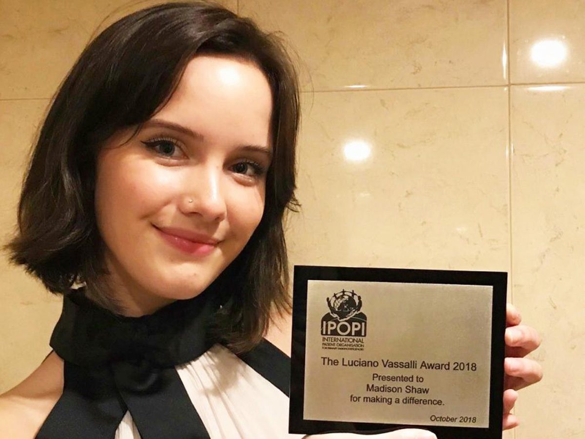After being nominated three times, Shaw was chosen to receive the Vassalli Award during the 2018 International Patient Organisation for Primary Immunodeficiencies (IPOPI) Conference in Lisbon, Portugal. Shaw is the first American to receive the Vassalli Award, which was created in honor of Luciano Vassalli, a young adult with PI who in his short life raised a great deal of awareness for the condition.