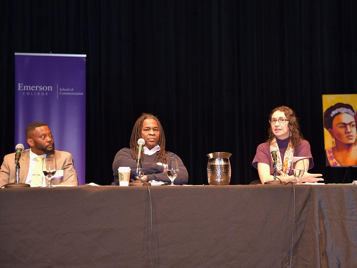 Emerson School of Communication MLK Celebration & Diversity Forum panelists, left to right, Boston Police Deputy Superintendent Marcus Eddings, Boston Globe columnist Adrian Walker, and Emerson Assistant Professor Mneesha Gellman. Photo/Molly Loughman