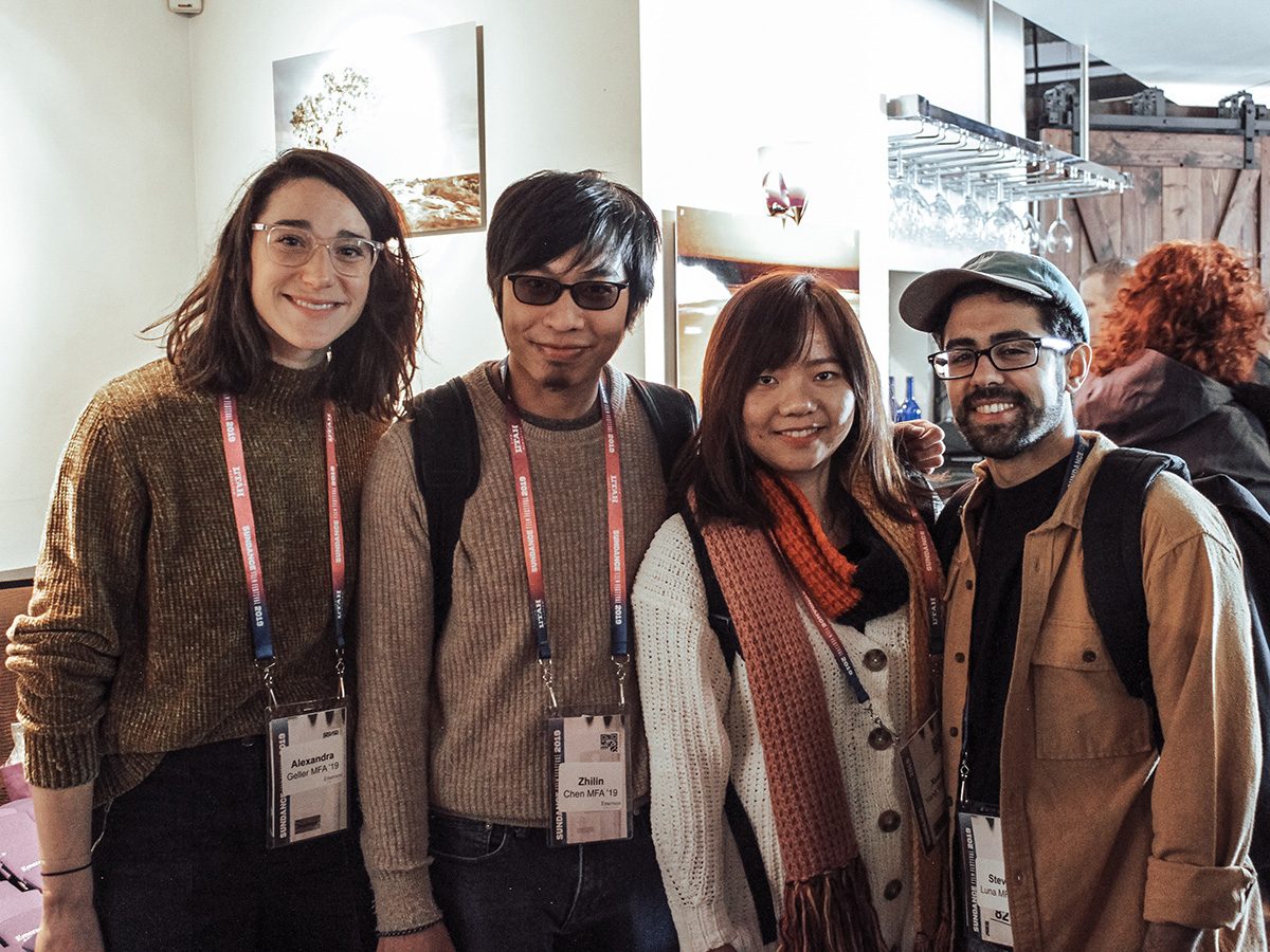 Emerson MFA students hobnob at a Sundance Film Festival event, left to right, Alexandra Geller, Zhilin Chen, Xueyi Yang, and Steven Luna.