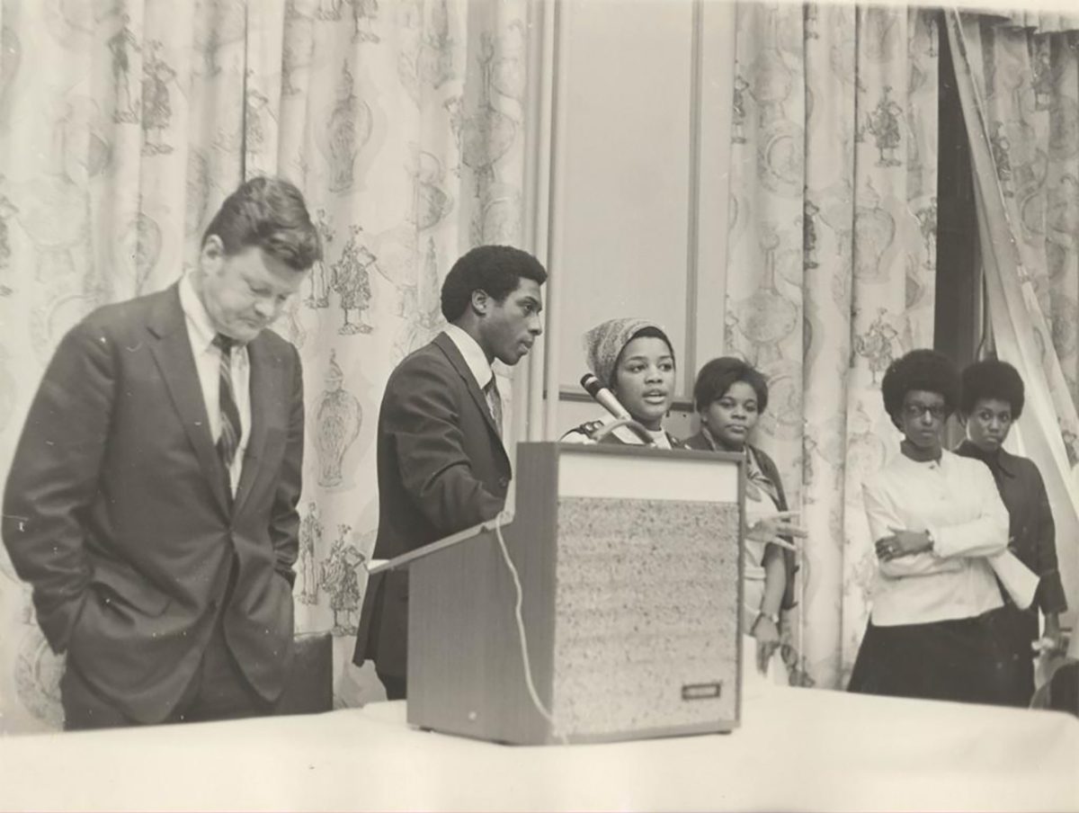 Fifty years ago, the student group EBONI (Emerson’s Black Organization with Natural Interests) was formed. Led by Emerson senior, Moonyene Jackson-Amis, third from left, the group presented a list of 10 demands to President Chapin, left. Tensions rose among students, faculty, and administrators until most of the demands were met. Photo/Emerson College Archives & Special Collections