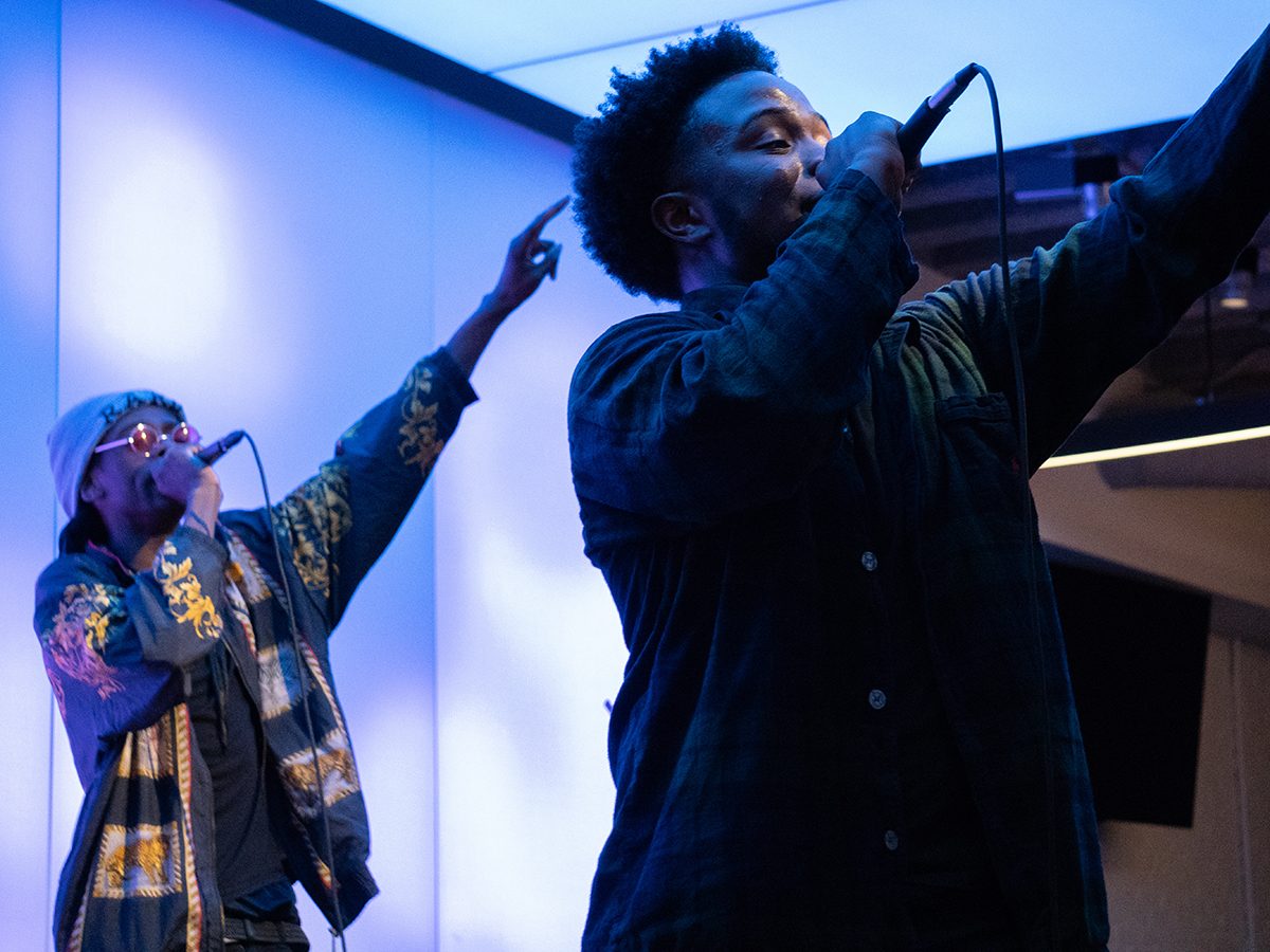 BostonRISE artists Clark LaCossade, left, and Eche Onwuama perform the last song of the night at the Diverse Voices in Communication event held Thursday, February 21, at Center Stage. Photo/Declan Berkeley ’22