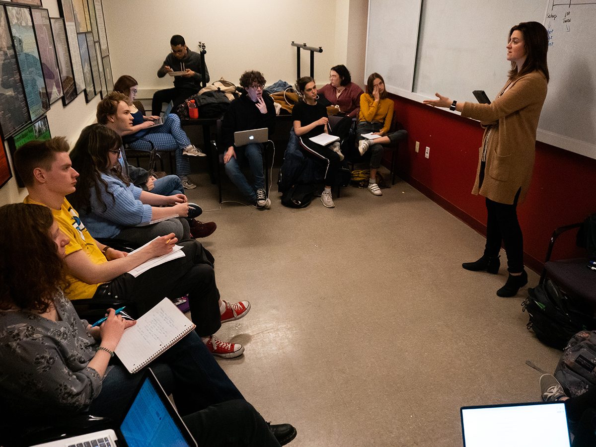 Affiliated faculty member Erin Schwall leads a meeting of student producers, writers, and performers ahead of Emerson’s first ComEx comedy festival, being held April 5 and 6. Photo/Declan Berkeley ’21