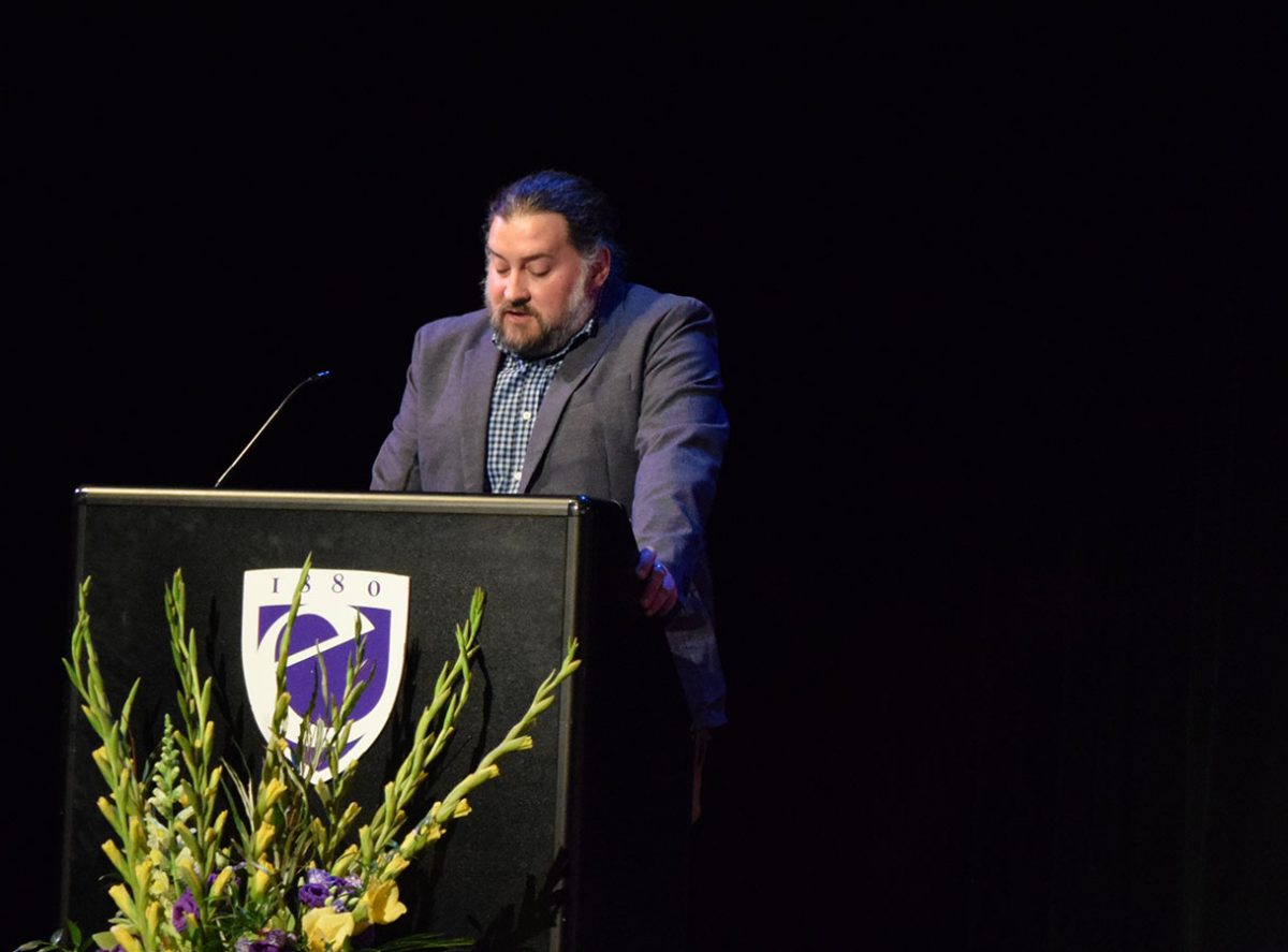 Steve Himmer, senior lecturer and First-Year Writing Program director, accepts Emerson College Alumni Award for Teaching Innovation at a ceremony held in the Semel Theater on April 5.