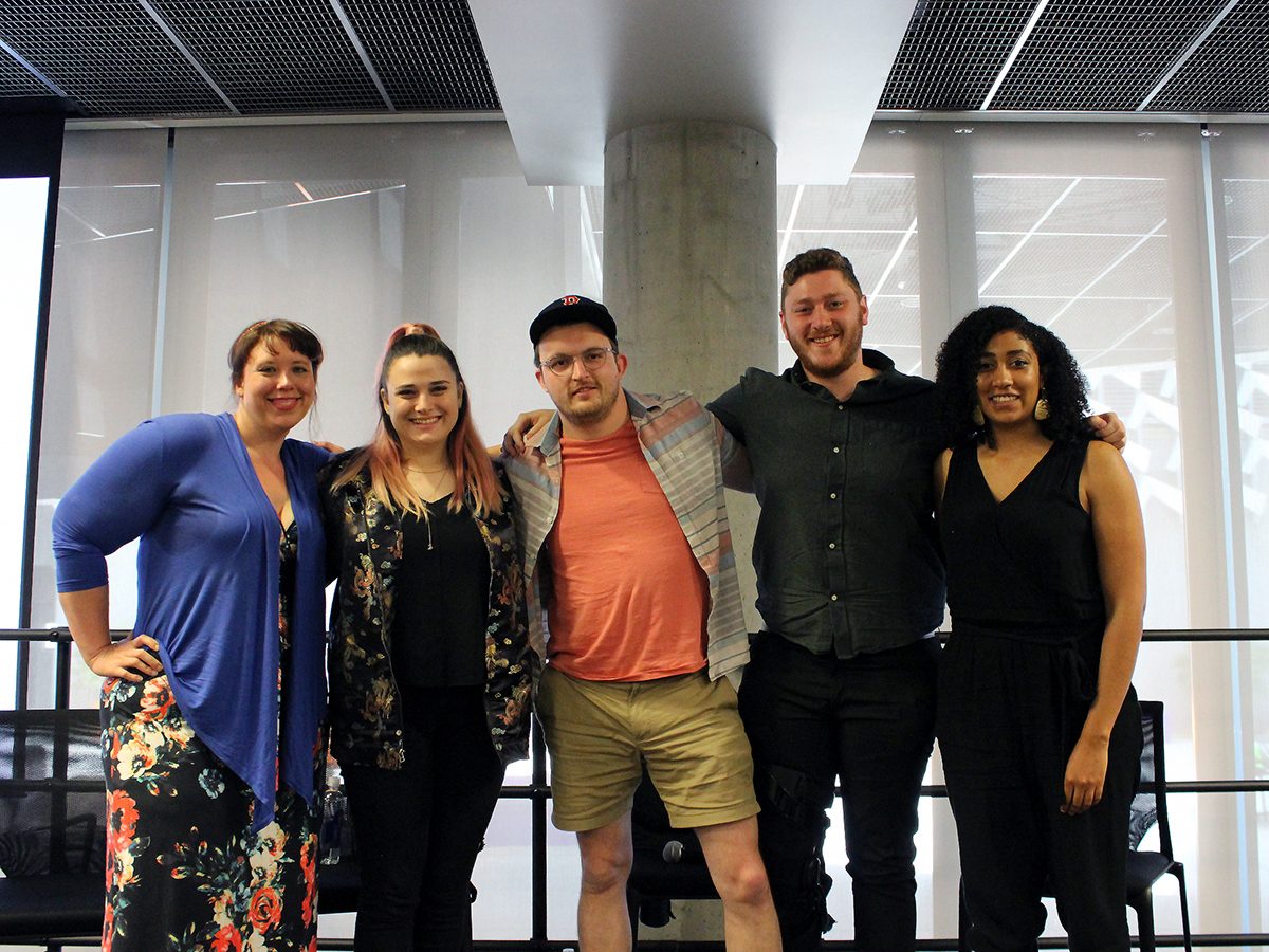 From left: Laura Kenar ’10, Chrissy Maroon ’13, Timothy Taylor ’14, Matthew Newman ’15, and Ripley Barnes ’15. Photo/Benjamin Crosby ’19