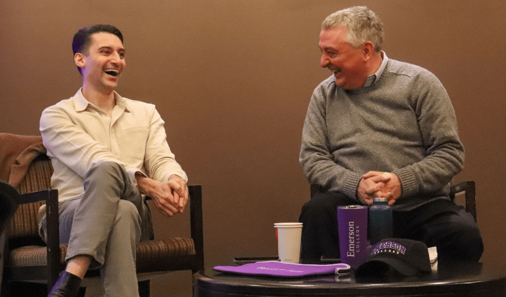 It’s this bluntness and humor that allow Collins to continue covering the “dystopia beat,” a journalist’s moniker for topics like extremism, disinformation, and conspiracy theories. An alum of the Emerson Journalism program, Collins visited campus on a Friday in October to discuss the dystopia beat with his former journalism professor, Mark Leccese, and a roomful of nearly three dozen students and faculty.
