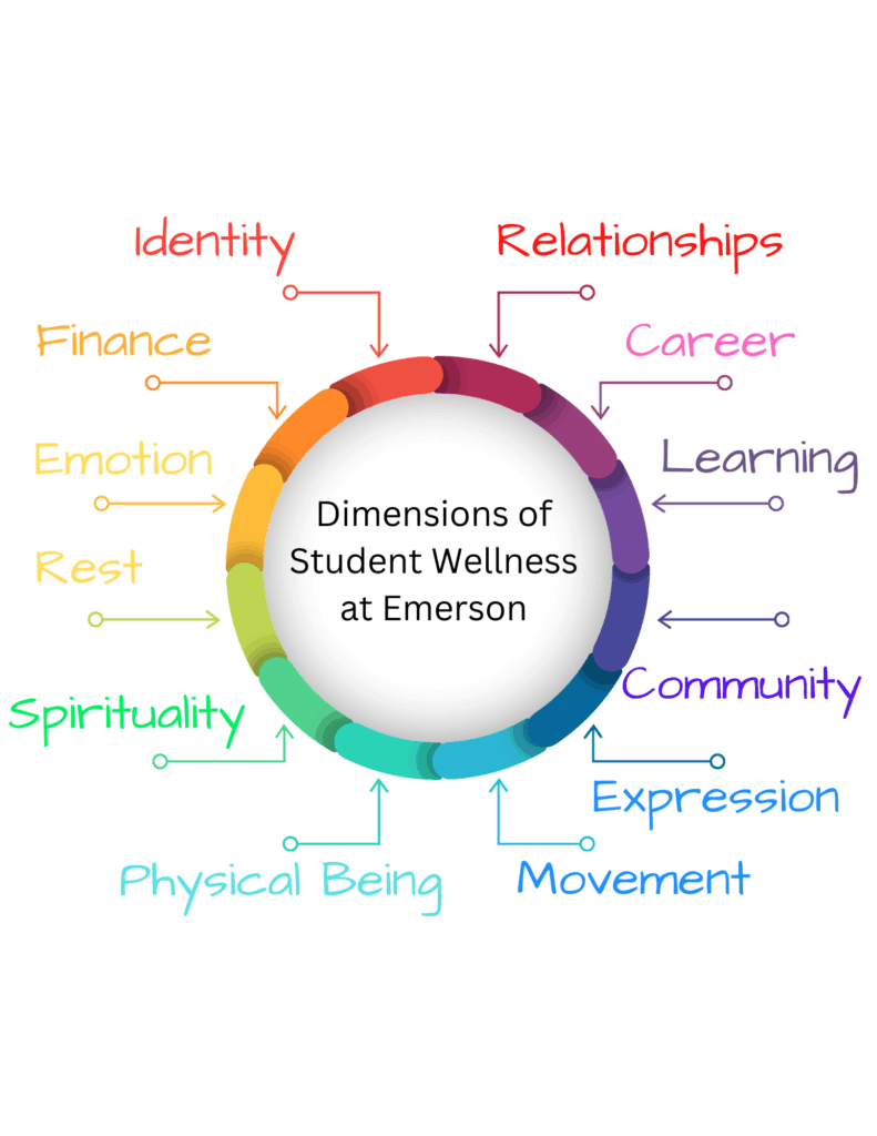 We believe wellness is holistic and multidimensional; positive and affirming; and inclusive. All dimensions of wellness need our attention for us to fully succeed. At Emerson, we recognize 12 dimensions and highlight these topics throughout the year.