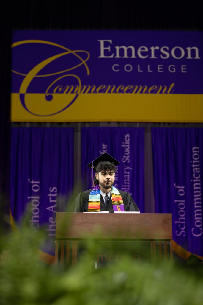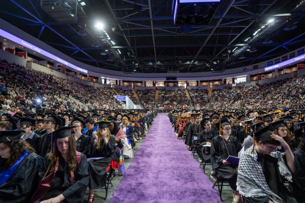 Earlier in the ceremony, Grand Marshal and Assistant Professor of Journalism Mike Brown kicked off Emerson College’s 2024 commencement ceremony with gusto – bestowing a missing element to the students’ academic experience.
