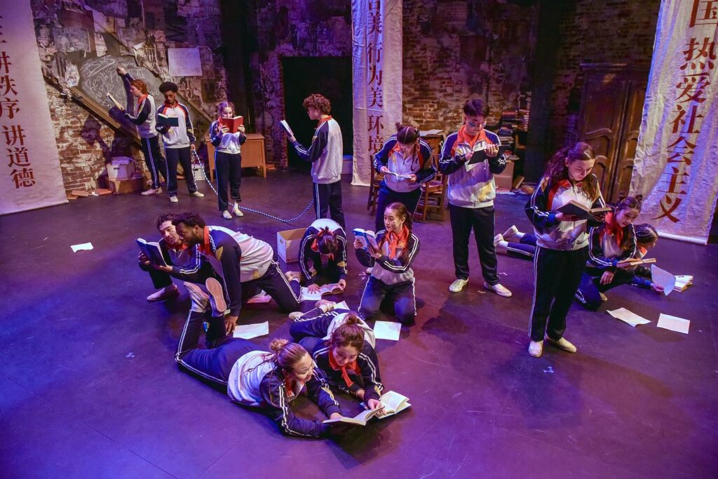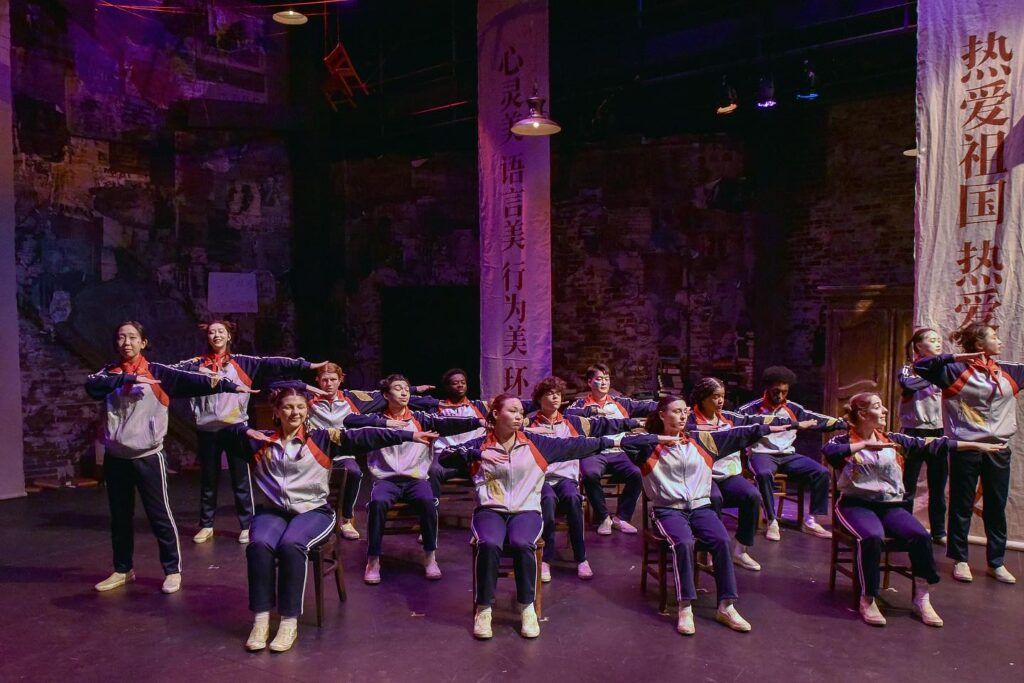 The play was set in a classroom, with chairs hanging from the ceiling, vintage furniture, and piles of books. HowlRound Theatre Commons Associate Producer Alison Qu ‘20, who co-directed the show with Performing Arts Assistant Professor Tushar Mathew, called the set a “liminal space” that could be reminiscent of any country, though there are specific references to China. Bilingual ensemble members did multiple scenes in both Mandarin and English.