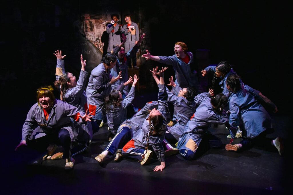 I Love XXX is a devised play. Whereas in a “straight play,” actors start from a script, a devised play is a form of theatre where the performing ensemble are also the collaborators in script-making and storytelling. Riley Sage MacMoyle ’25 was co-dramaturg and an ensemble cast member, and this was her first devised theater experience.