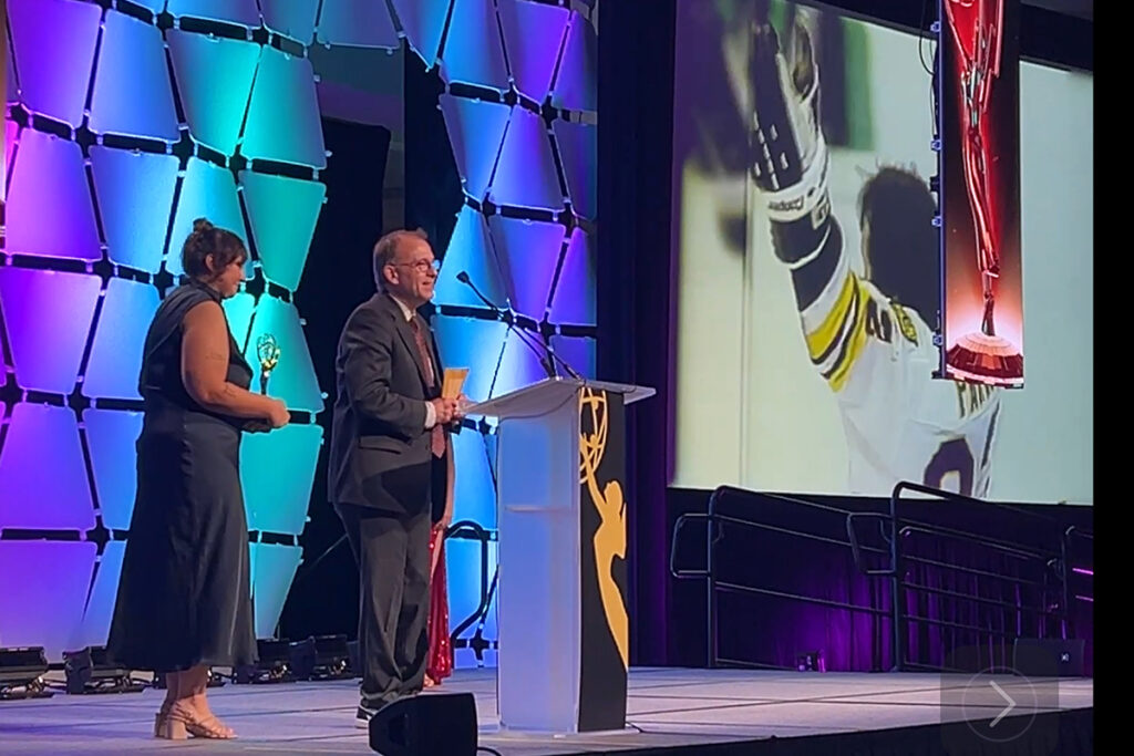WCVB reporter Sharman Sacchetti ’93 and assistant news director Gerry Wardwell ’80 each took two awards, sharing the Emmy for Breaking/Spot News – Single Report for their coverage of campus protests with photographers Mark Reynolds ’84 and Ted Phillips ’77. Sacchetti also won in the Breaking/Spot News – Multiple Reports category alongside producer Isabel Indresano ’21 for coverage of a Boston city councilor arrest, and Wardwell won for Team Coverage for WCVB’s treatment of the Boston Celtics’ victory parade.