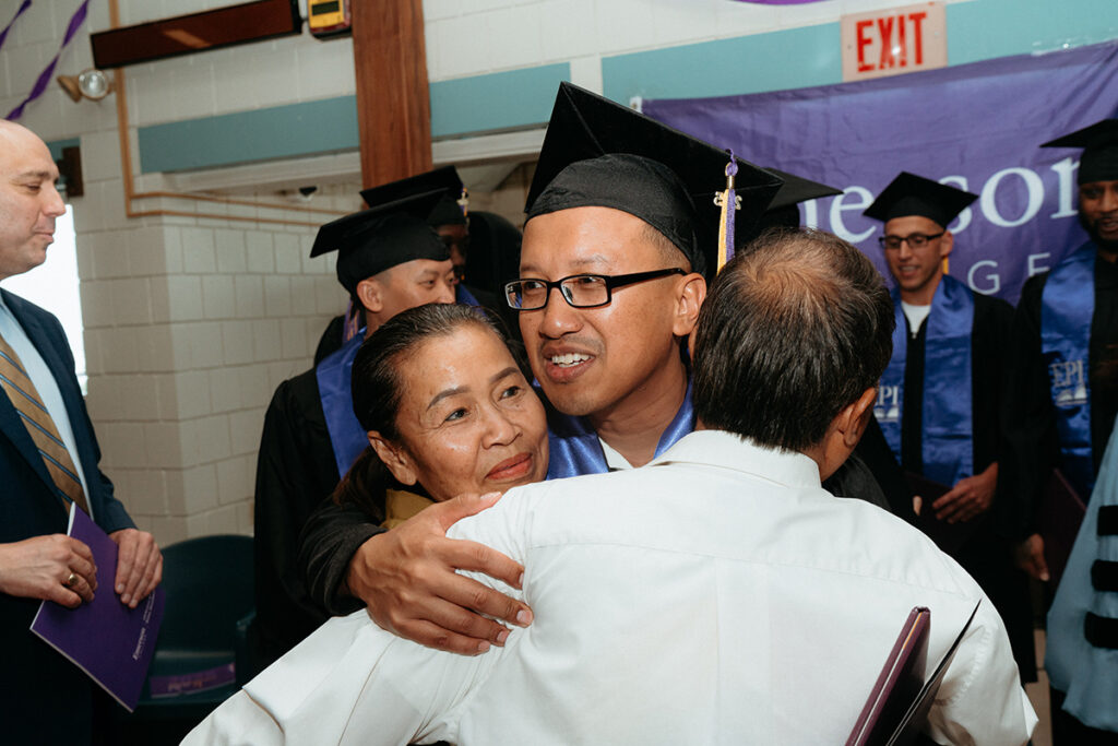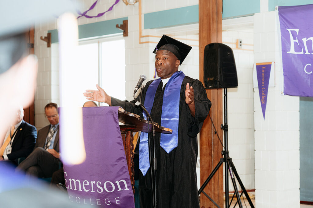 Colón and six graduates from the second cohort of EPI, one of the few educational offerings of its kind in Massachusetts, received bachelor of arts degrees in Media, Literature, and Culture. Colón, Peter Bin ’25, Marcus Blanton ’25, Soi Ket Dang ’25, Ryan Pezzini ’25, Edker Rock ’25, and class speaker Maxwell Wiggins Jr. ’25, join 11 men who previously have received Emerson degrees through the prison initiative, many of whom have since been released and attended the ceremony to support the new graduates.