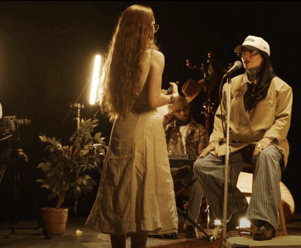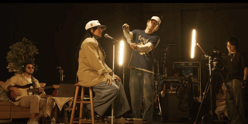 Between takes, Gibeau asked Bello to “really go whole body and soul” on the next take. Gibeau also encouraged students to proactively participate in giving feedback. Taking the cue, Sienna Leone ’26 stepped forward with her own note, giving the singer a sense of the frame, encouraging her to raise her hands so they would appear on camera.